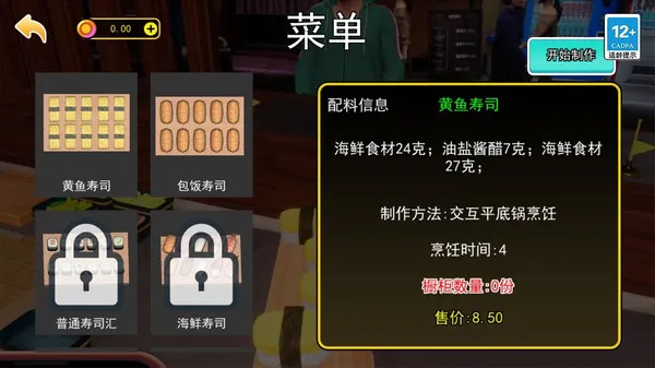 玩家最初拥有一间简陋的寿司摊位,需要购买基本的食材,如米饭、鱼肉、海苔等,并制作简单的寿司售卖。随着收入的增加,可以逐步扩建店面,升级厨房设备,解锁更多高级食材。