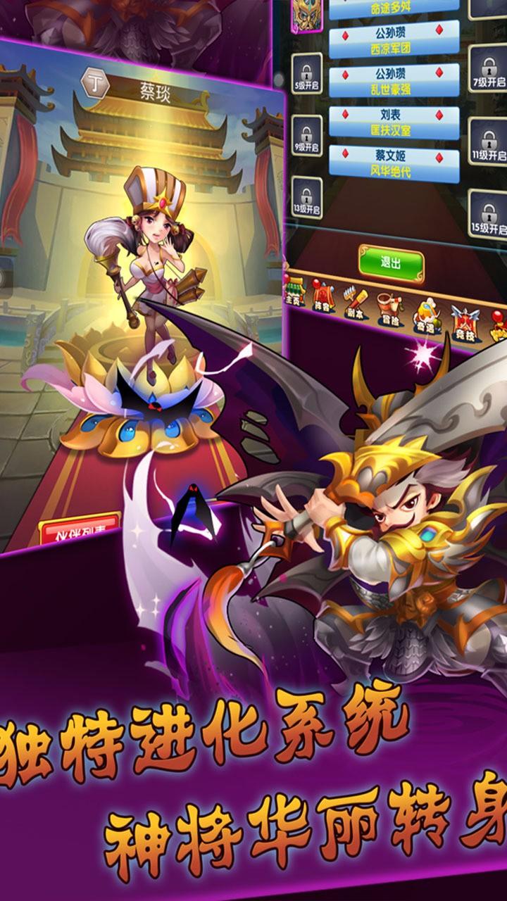 战斗:战斗采用半自动模式,玩家可以操控武将释放技能,调整阵型,利用地形和兵种克制来取得胜利。游戏中有多种战斗模式,包括剧情关卡、竞技场、世界BOSS等,挑战不同的敌人,获得丰厚的奖励。